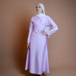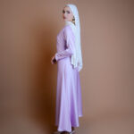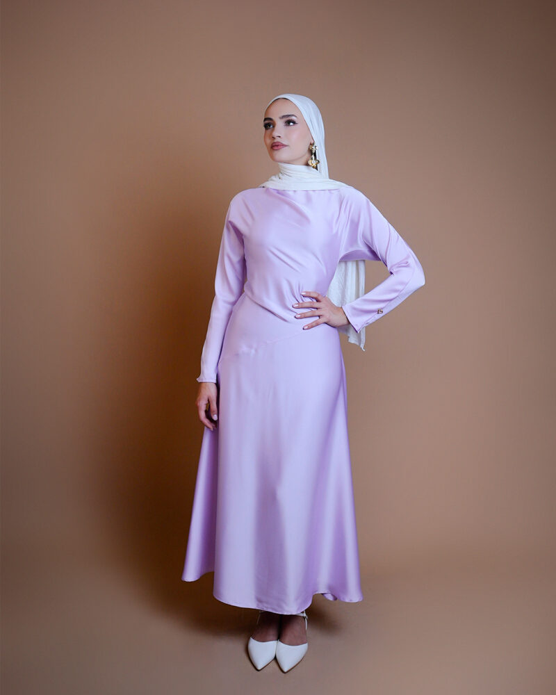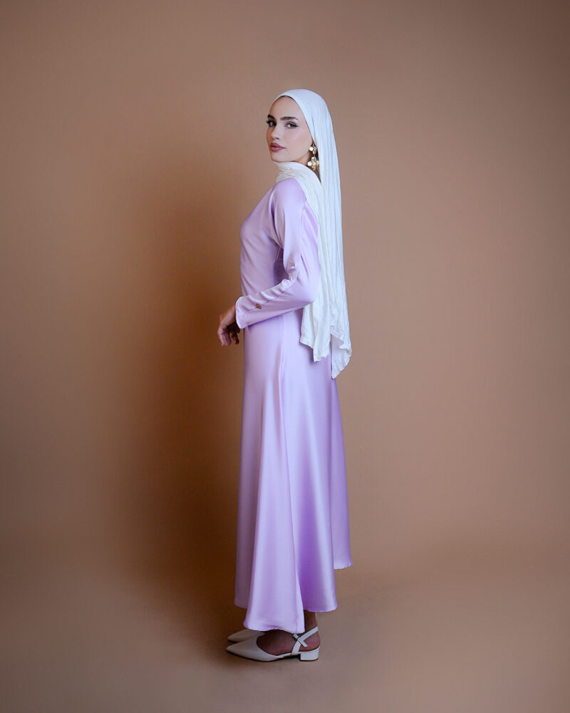 Cut from sumptuous premium satin, this gown offers a fluid, sculpted silhouette that glides effortlessly with every step.The elongated sleeves evoke regal refinement, while the softly cinched waist and graceful full-length skirt create an ethereal, elongated shape.