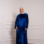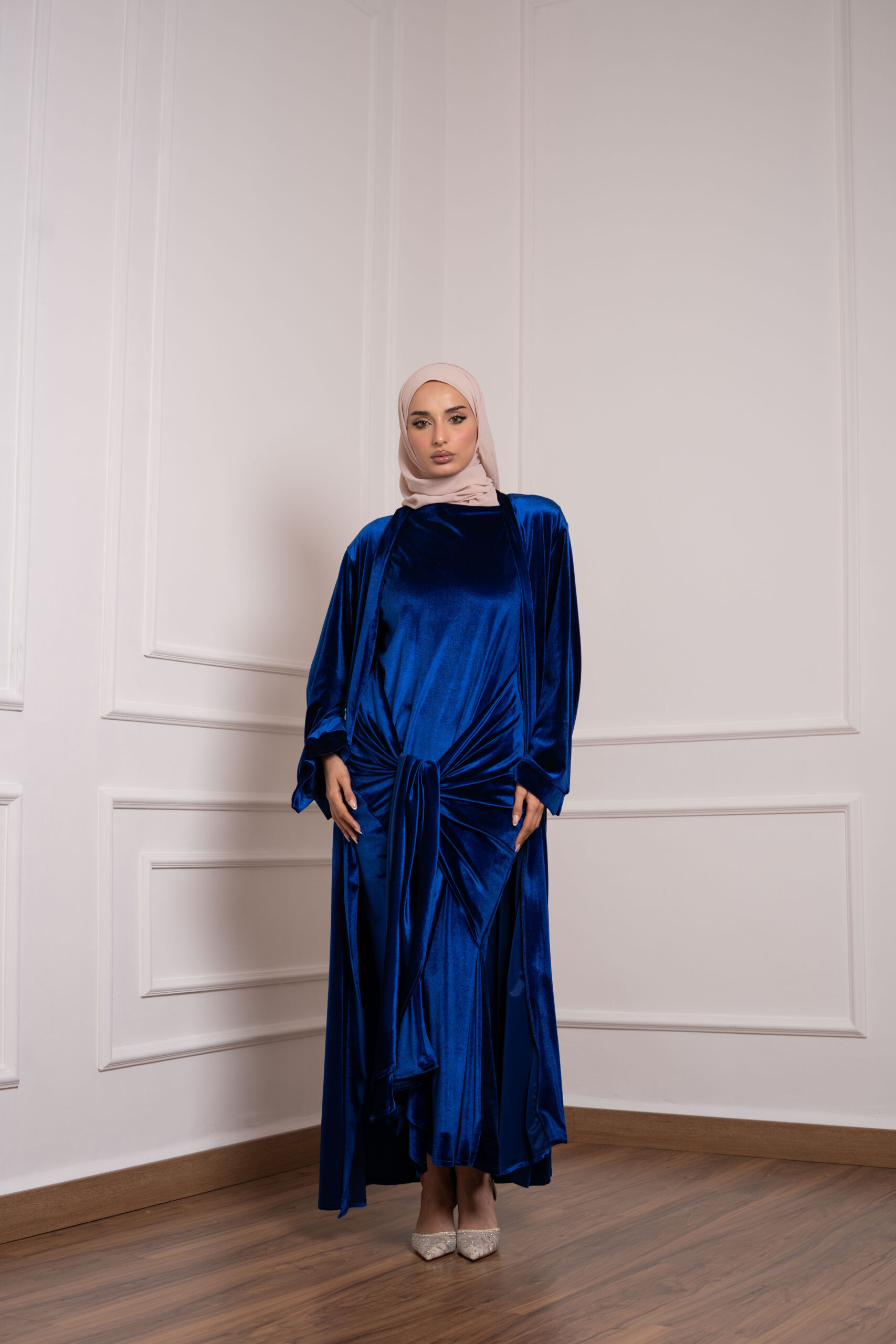 The soft velvet fabric reflects light beautifully, giving the set a subtle sheen that enhances its premium aesthetic. The open-front abaya drapes effortlessly, while the inner dress features a flattering tie-front detail that gently defines the waist without compromising modest coverage. Together, the pieces create a harmonious and polished look.
