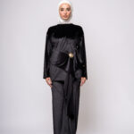 Elevate your look with this luxurious velvet set, crafted from soft, rich-textured fabric. It features a matching belt that can be tied for a custom fit or styled with a gold pin for an elegant touch.