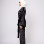 ارتقي بإطلالتك مع هذا الطقم المخملي الفاخر، المصنوع من قماش ناعم وذو ملمس غني. يتميز بحزام من نفس القماش يمكن ربطه حسب المقاس المفضل لديك أو تزيينه بدبوس ذهبي لمسة أنيقة. الطقم مزين بشارة ذهبية مطلية بالذهب تحمل اسم العلامة التجارية Kharzaat، لإضافة لمسة فاخرة. عملي وكلاسيكي، مناسب للإطلالات اليومية والمناسبات الخاصة. متوفر بالمقاسات S، M، L، ومقاس واحد L يناسب XL.